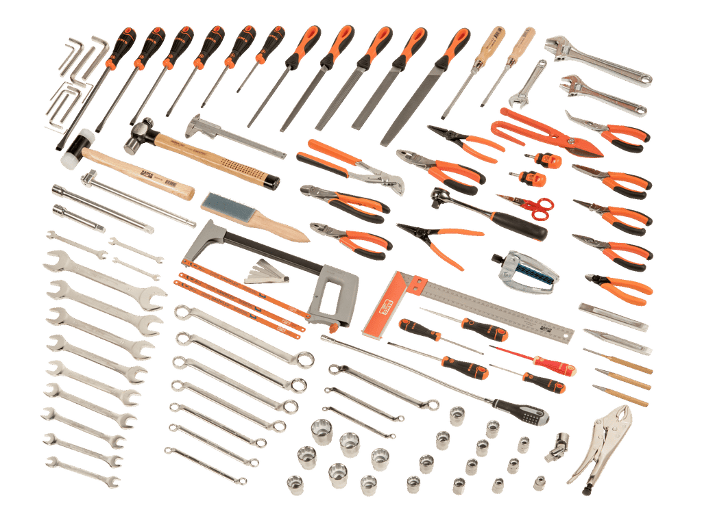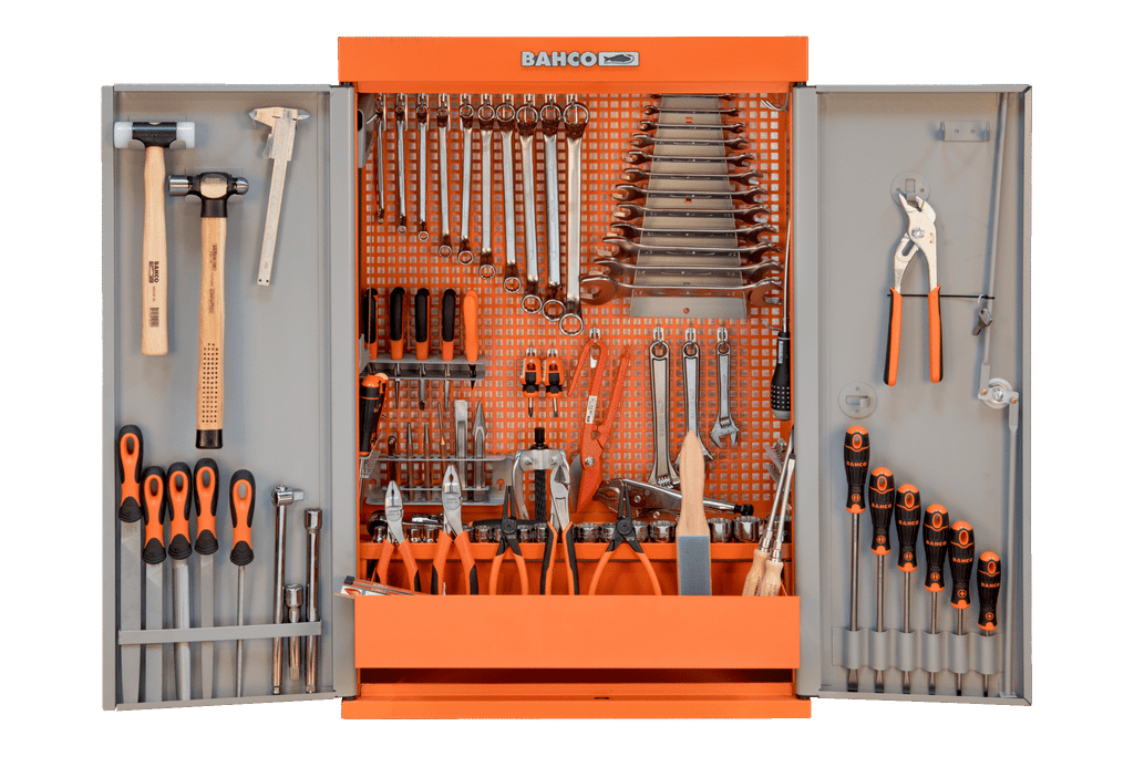 Tool cabinet with two doors, tools and hooks