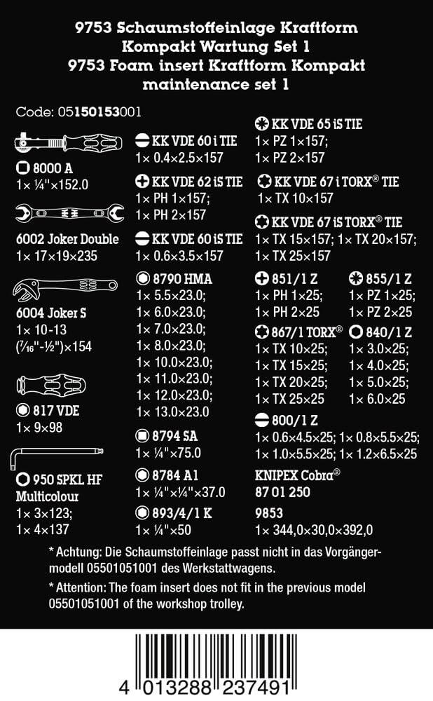 - 1x 9853 Foam insert Kraftform Kompakt maintenance set 1, without tools: 344 x 30 x 392 mm