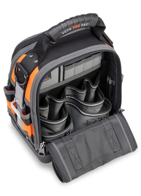 Internal Features: The inside front has a fully featured storage compartment holding 3 rows of tools up to 31.75cm (12.5″). The reverse side has compartments for meter storage, and a small cordless drill plus further pockets for hand tools. It is smaller than the Tech LC with a foot print of 20.3cm x 25.4cm (8″ x 10″)